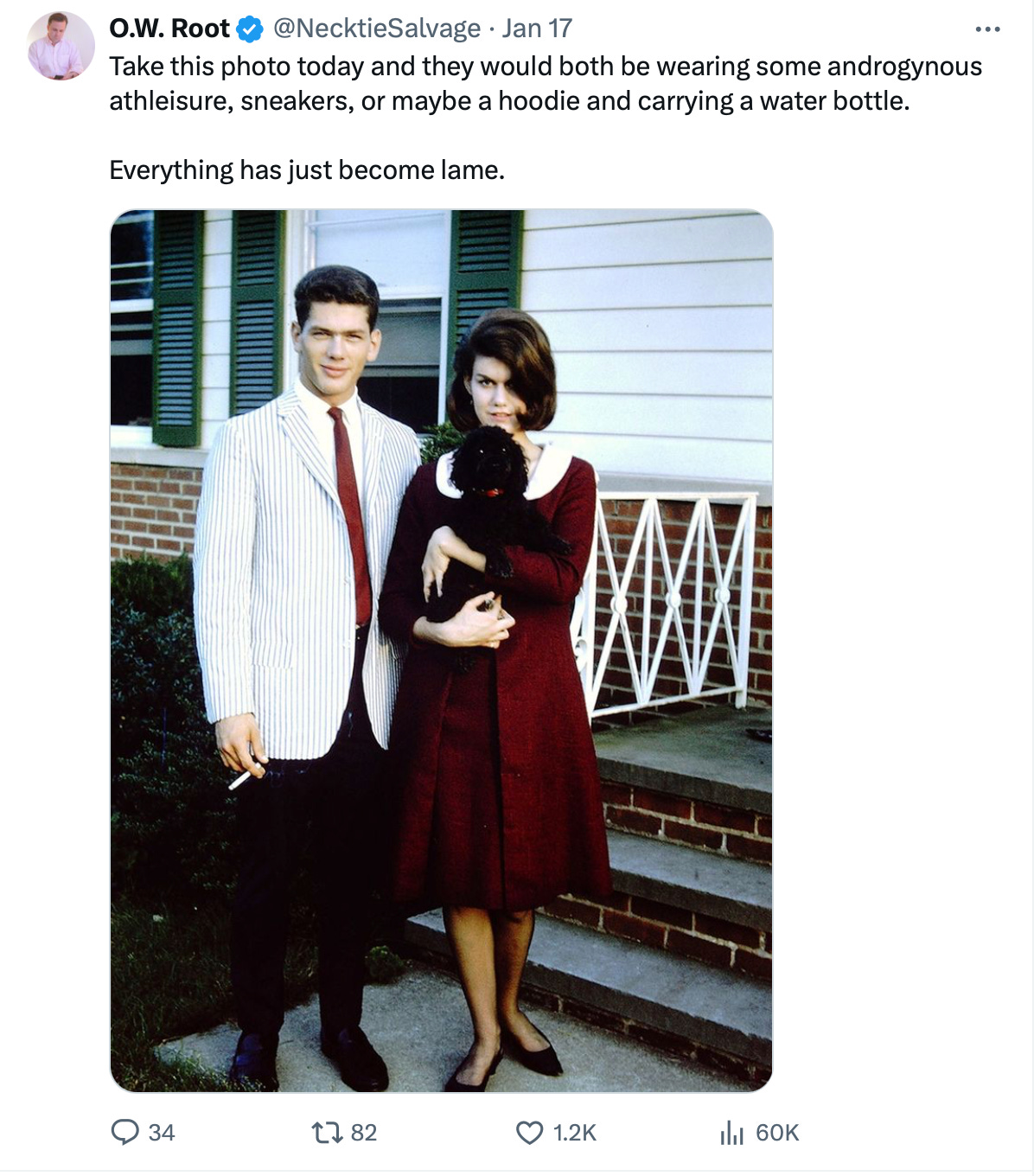 Distinctives, or, polarity is right, and feels right. What do I believe is beneath excessive casualness and the cultural acceptance of wearing pajamas and athleisure in public? The worship of the immature.